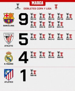 En deuxième position, l’Athletic Club de Bilbao, avec cinq doublés, majoritairement obtenus dans les premières décennies du football espagnol, rappelle la grandeur historique du club basque. Le Real Madrid, pourtant le club le plus titré en Liga, ne compte « que » quatre doublés, un chiffre étonnamment bas au regard de son palmarès global. Atlético de Madrid ferme la marche avec une seule saison faste, celle de 1995-96, sous la houlette de Radomir Antić.